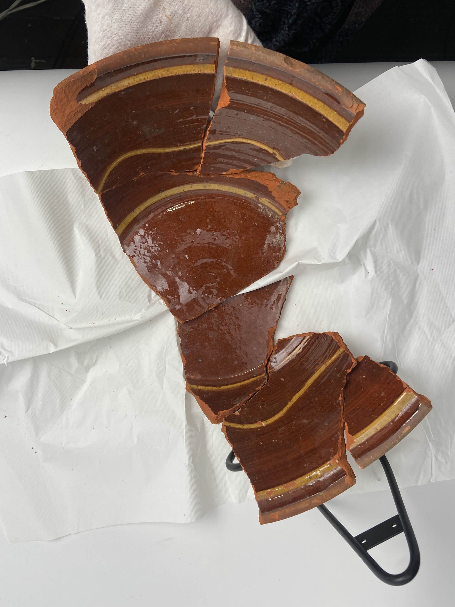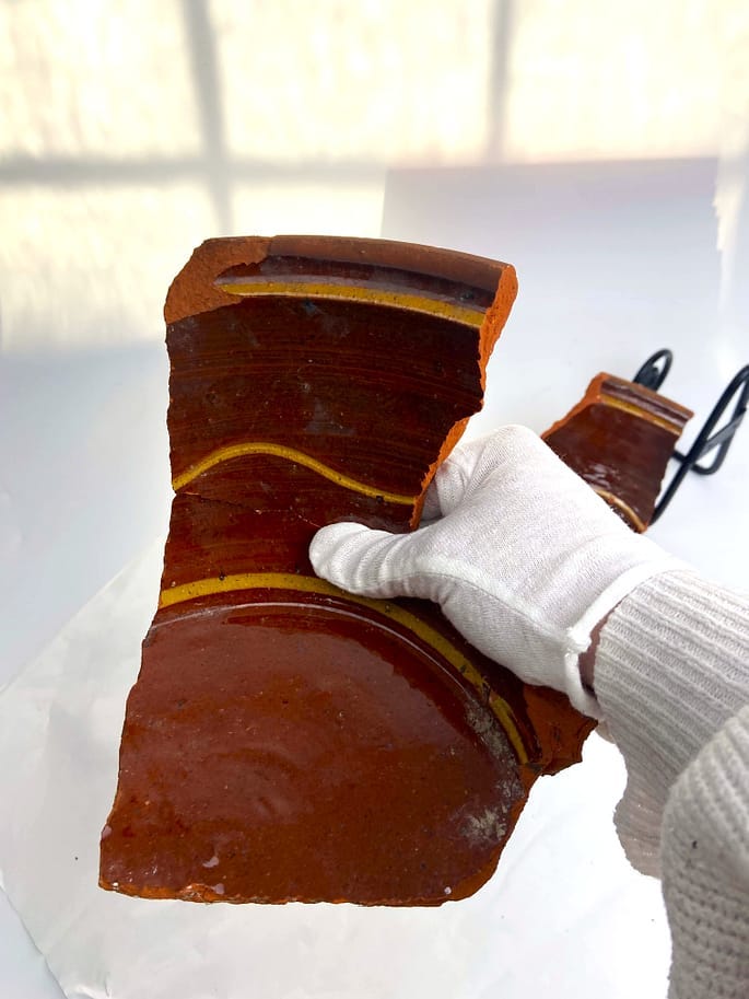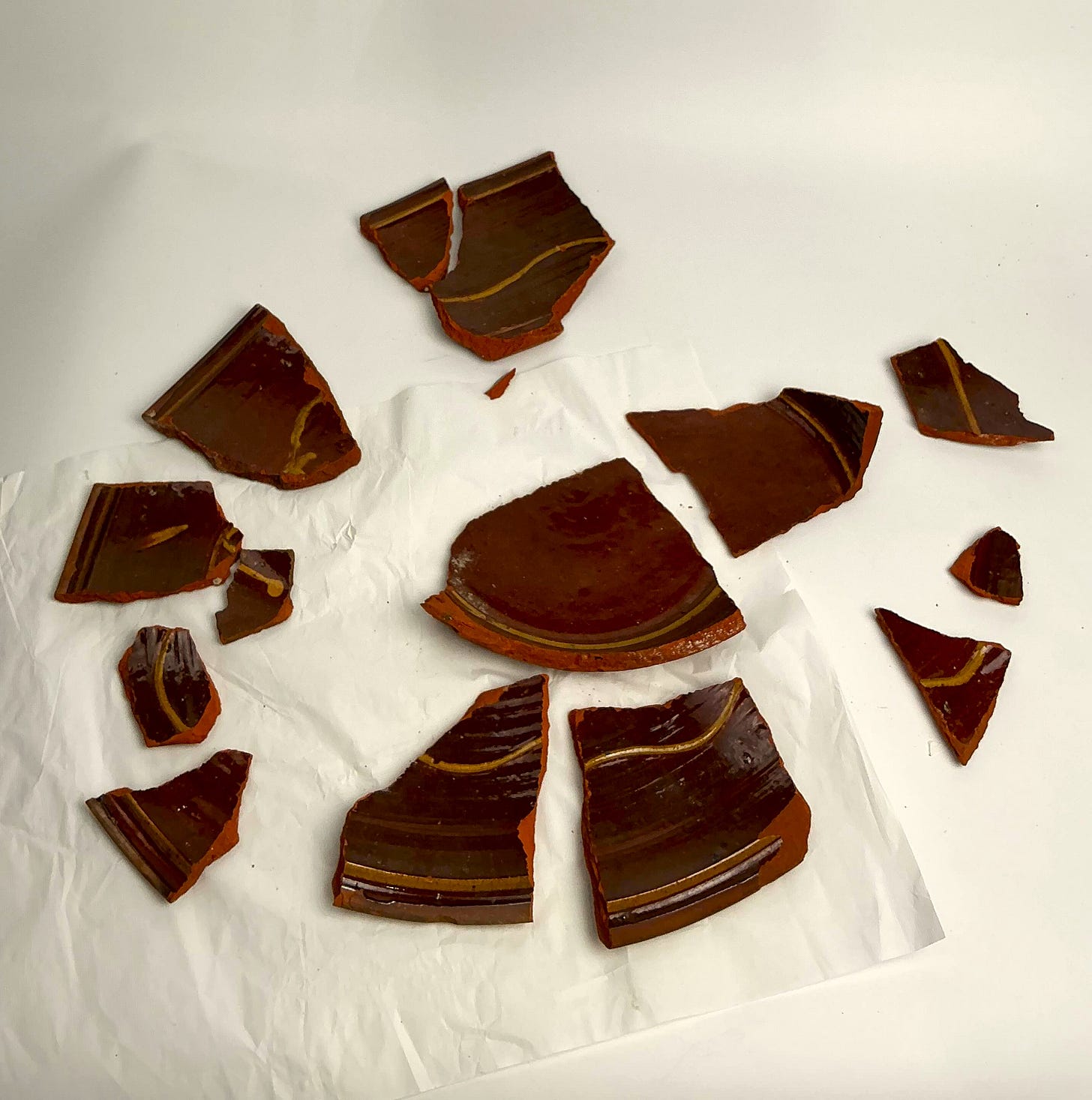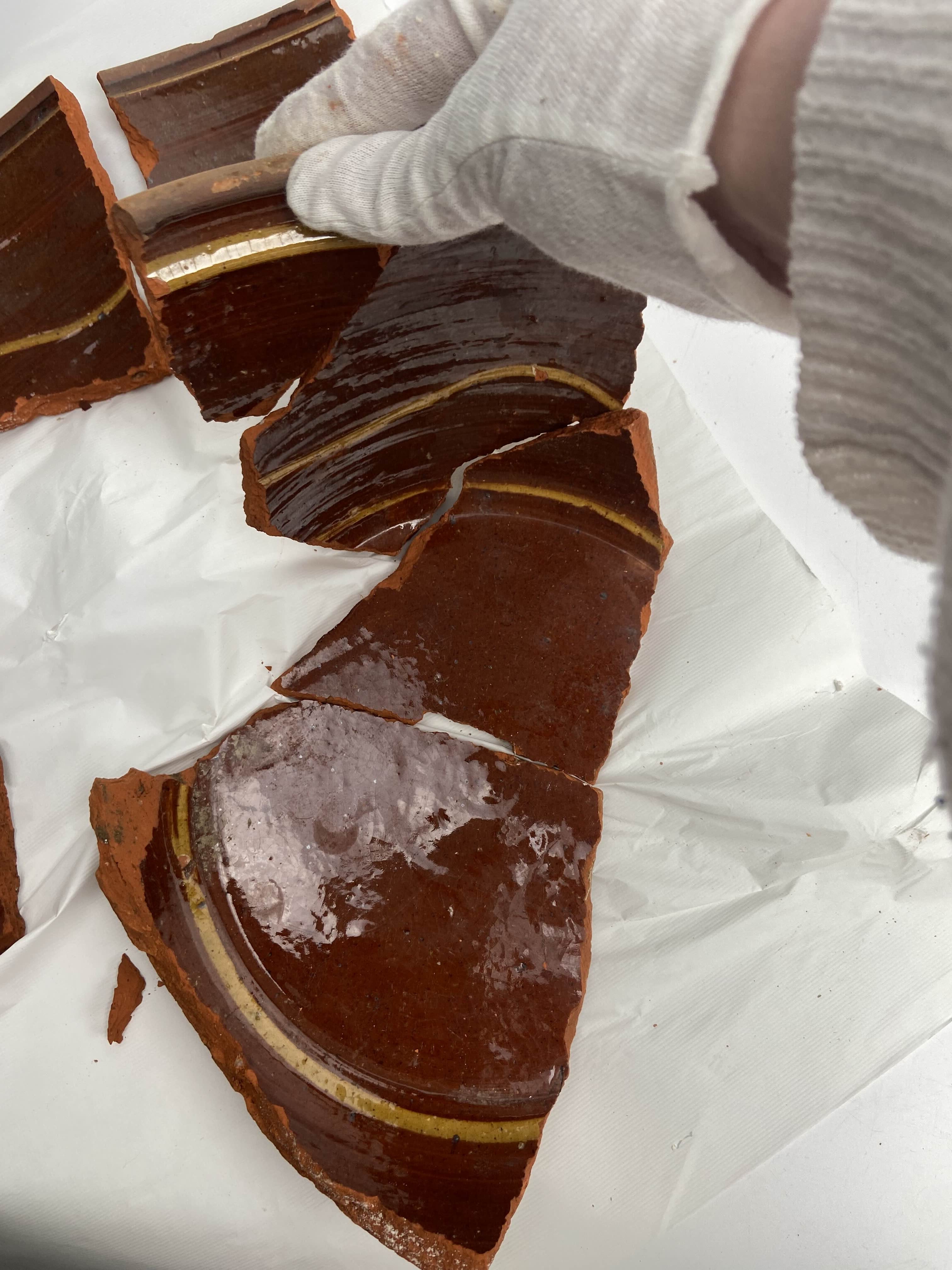 We believe this is slip-trailed redware, so we tried to piece together larger fragments to see the vessel’s original shape. Understanding its shape helps us learn about its possible uses.