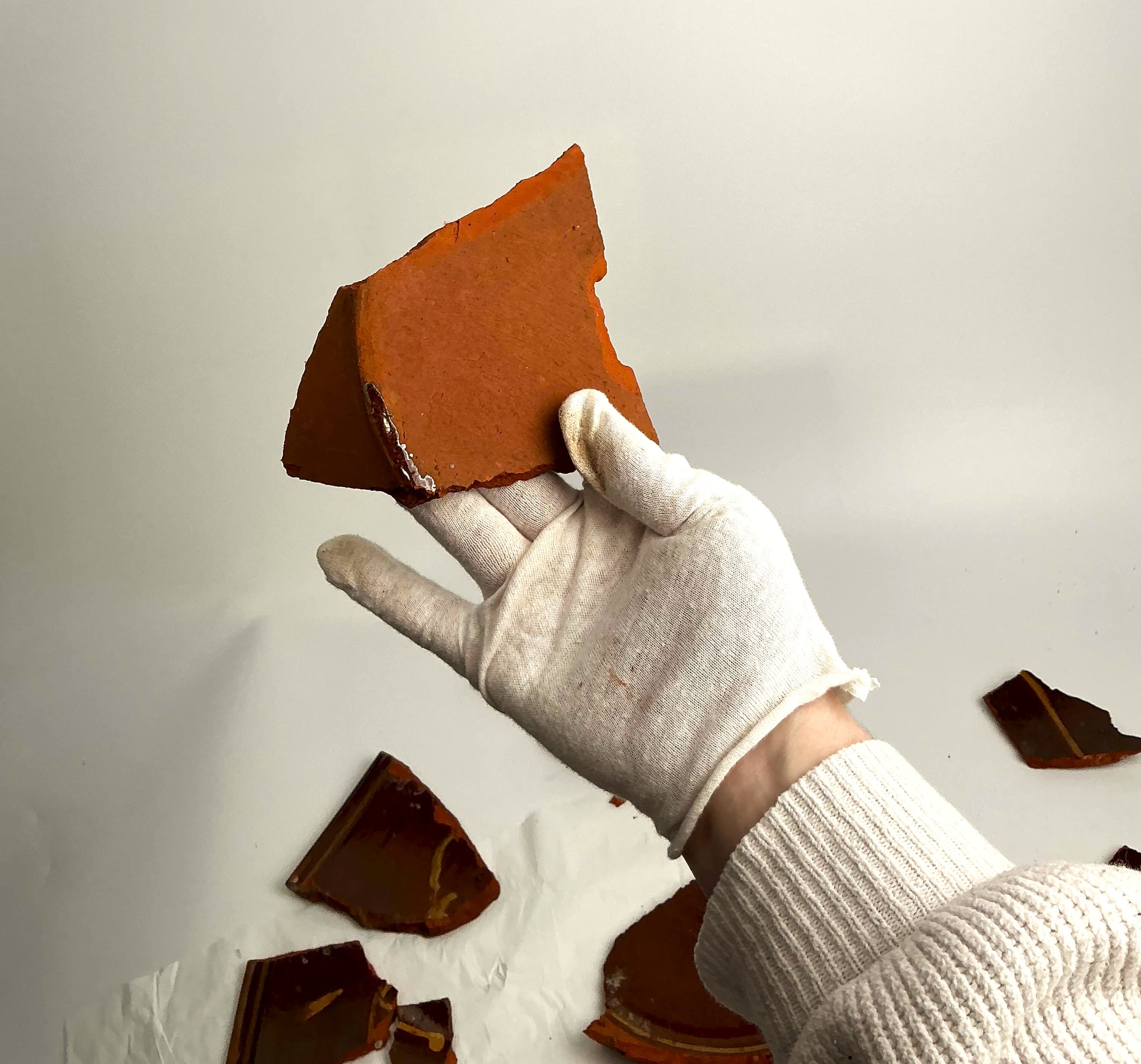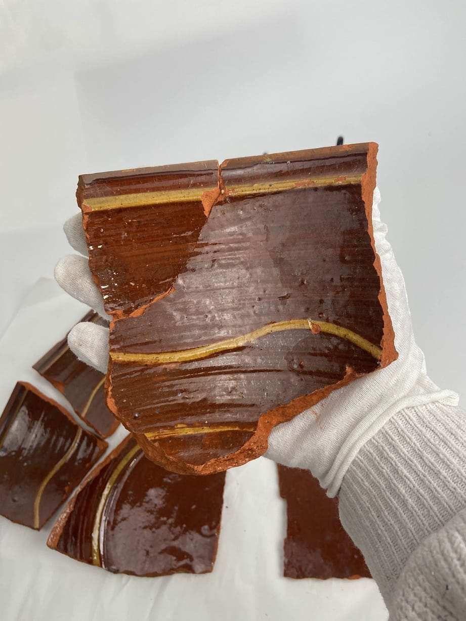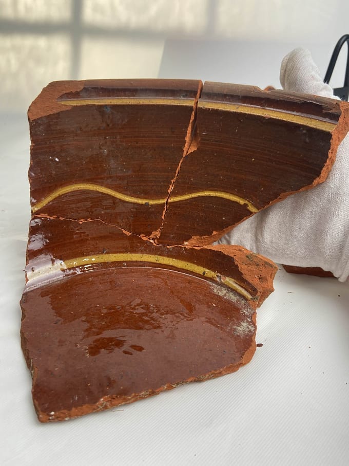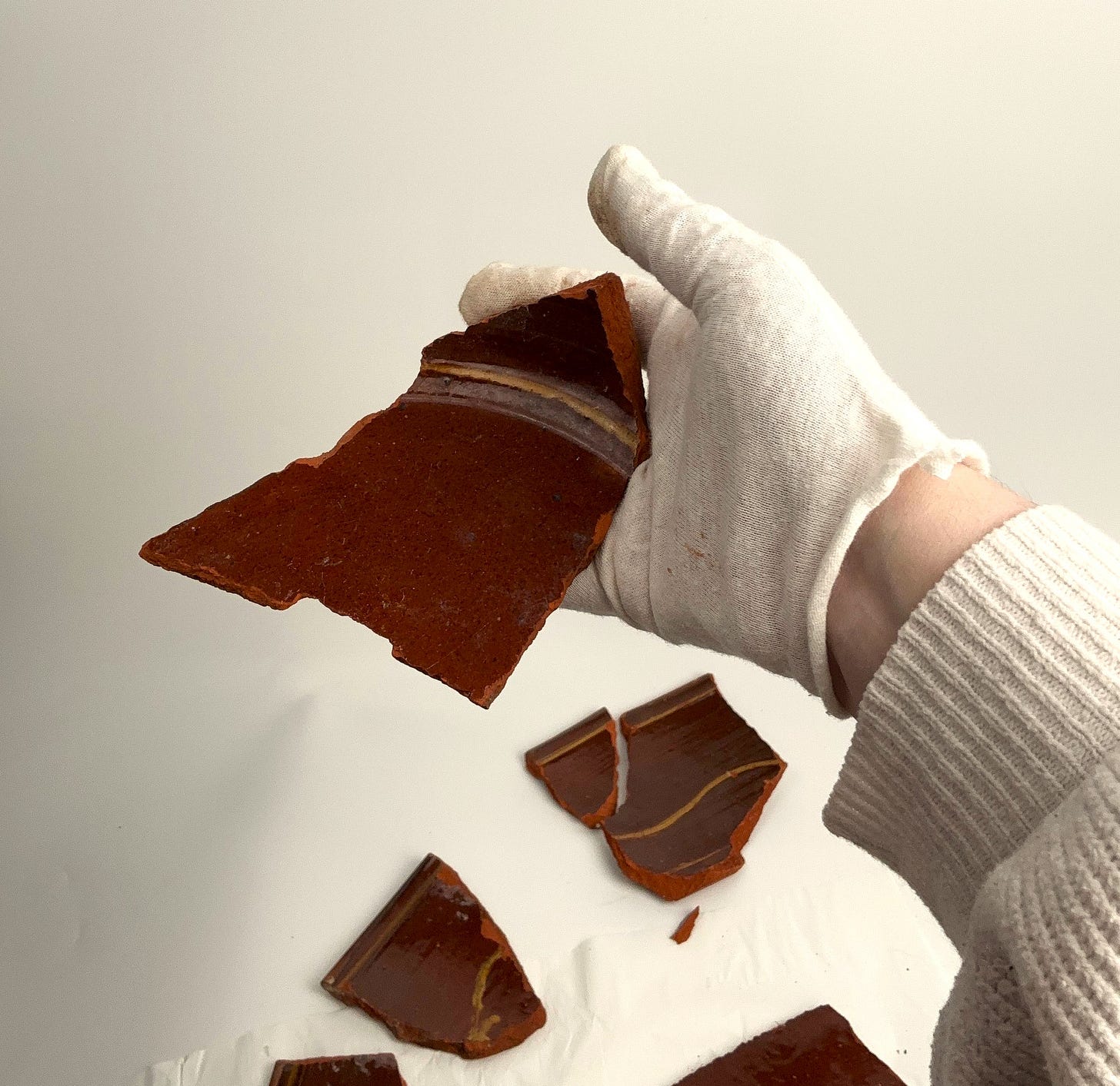 We believe this is slip-trailed redware, so we tried to piece together larger fragments to see the vessel’s original shape. Understanding its shape helps us learn about its possible uses.