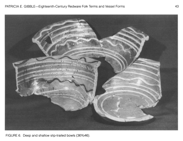 Note the ‘squiggle’ design on the shard above. It features a distinct design that we call ‘slipware’ or ‘slip-trailed redware’ today.